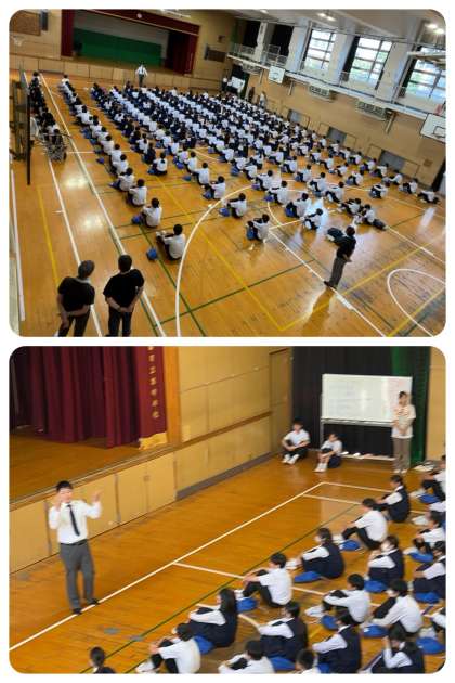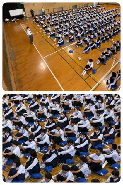 集会では、国語の先生から「コミュニケーションは、『言葉』だけでなく、表情などの『ノンバーバル』な要素があります。良好な人間関係を築くためにも、相手の顔を見て、表情豊かにコミュニケーションすることを心がけましょう。また、来週のフィールドワーク(校外学習)に向けて、安全と健康に留意するとともに、グループでの行動になるので、一人ひとりがルールやマナーを守って、行動しましょう」などの旨のお話がありました。