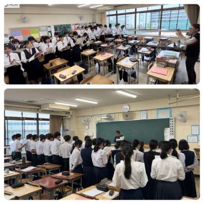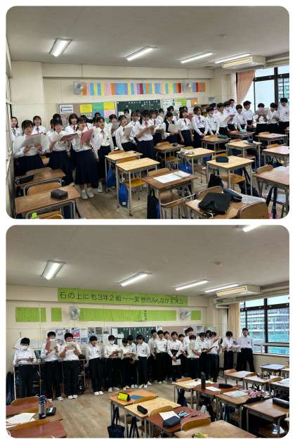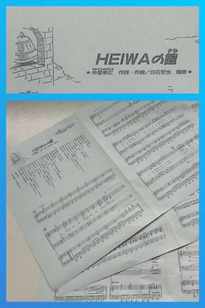 『HEIWAの鐘』を全員合唱します。5月31日(金)6時間目には、学活の時間を使って、クラスごとや2クラス合同で教室や廊下で練習を行い、素敵な歌声が校舎に響き渡りました。