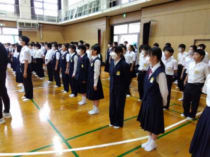1年生は体育館で一泊移住に向けての取り組みを行いました。班編成の確認とキャンプファイヤーの歌の練習をしました。