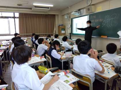 2年数学:「式による説明」の単元でカレンダーの数字の関係を式を使ってどう説明するのかを、班ごとに考え発表しました。どの班もうまく説明していました。