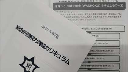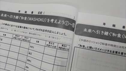 その後、総合的読解力育成カリキュラムについて、学年担当の先生から、3年生が取り組むテーマ「未来へ引き継ぐWASHOKUを考えよう」のガイダンスと最初のページについて取り組みました。