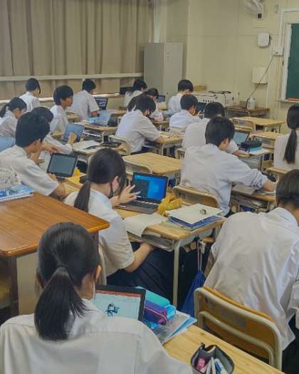 もう一方の英語の授業では、日本の家について、英語で発表するために一人一台端末を使ってスライド作りに励んでいました。