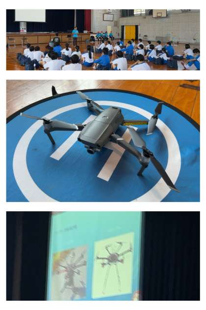 講師の先生方から、ドローについての説明を聞き、空撮・人命救助・農薬散布などに利用されていることなどの話を聞いています。免許は16歳になれば取れるそうです。