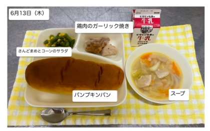 本日の給食では『鶏肉のガーリック焼』が提供されます。1・2年生の皆さん、しっかりいただいて残食ゼロをめざしましょう。