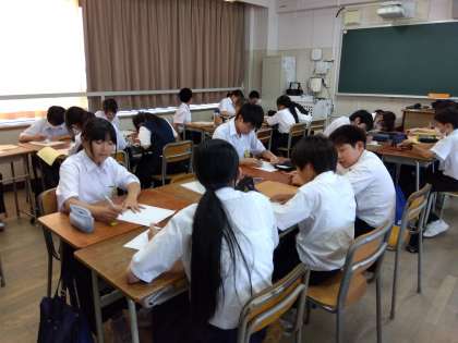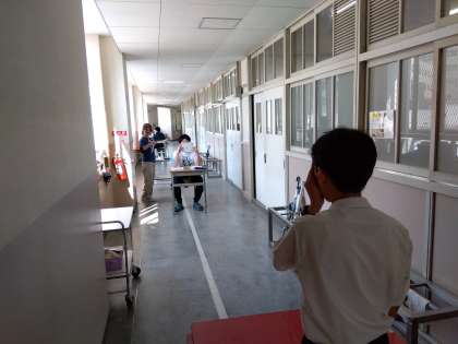 1年総合:一泊移住についての壁新聞を作成しています。合わせて裸眼視力も計測しました。