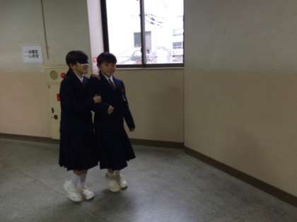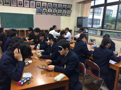 5〜6限にアイマスク等の体験をペアを組んで校舎内の廊下や階段、教室を使って行いました。視覚以外の情報で何が分かるのか、どんな事が出来るのか、慣れないながらも皆さん頑張って取り組んでいました。
