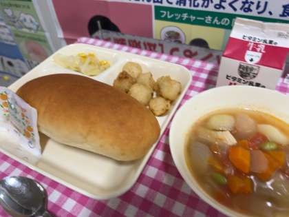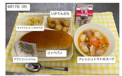 本日の給食です。「いかてんぷら・フレッシュトマトのスープ煮」などが提供されます。スープ煮には、生のトマトを使用しています。しっかりいただいて、午後の活動に備えましょう。