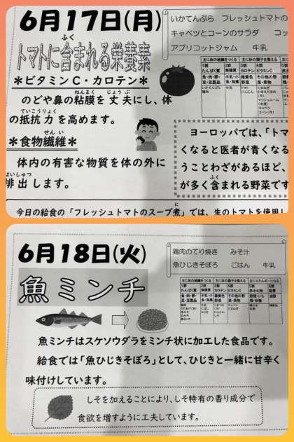 明日は、「鶏肉のてり焼き・魚ひじきそぼろ」などが提供されます。お楽しみに。
