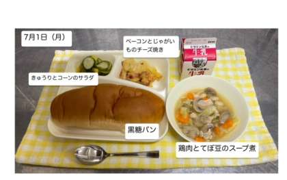 本日の給食に、鶏肉とてぼ豆のスープ煮、ベーコンとジャガイモのチーズ焼き、きゅうりとコーンのサラダ、黒糖パンが提供されます。しっかりいただいて、残食ゼロをめざしましょう。