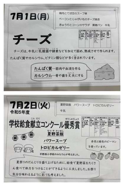 明日は、昨年度の学校給食献立コンクールの優秀作品「夏野菜飯・パワースープ・トロピカルゼリー」が提供されます。お楽しみに。