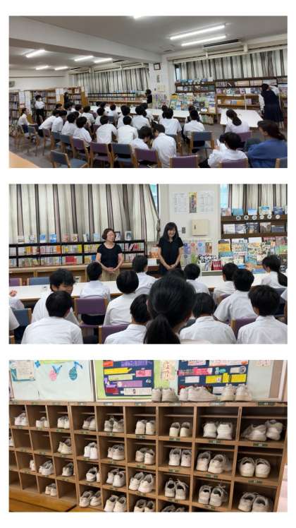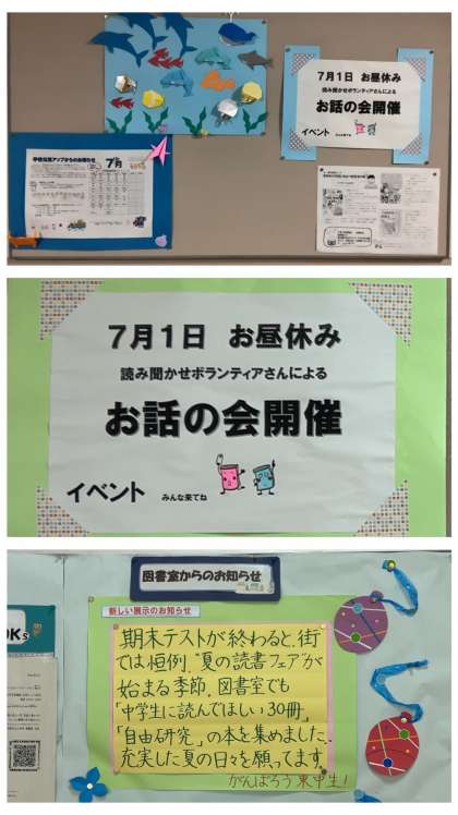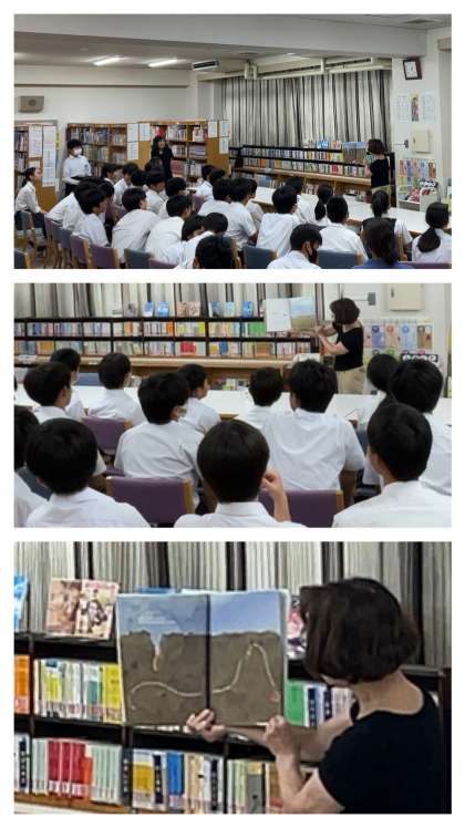 お昼休みの図書室で、お二人のボランティアさまによるお話の会を開催したところ、50人ほどの生徒の皆さんが熱心に聞き入っていました。次回は2学期です。お楽しみに。