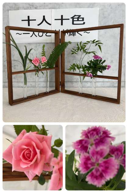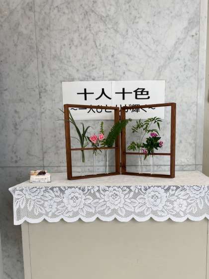 空が雲に覆われた朝を迎えました。玄関のお花を生け替えていただきました。お題は「雨音」、お花は「バラ・撫子(なでしこ)・ジャスミン・玉しだ・ミソカンサス」。今の季節にぴったりのお題とお花です。いつも東中生のためにありがとうございます。