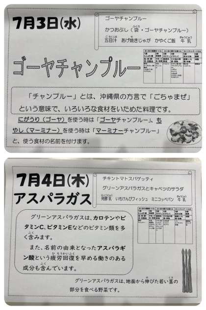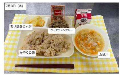 本日の給食です。「ゴーヤチャンプルー・あげ焼きじゃが」などが提供されます。しっかりいただいて、暑さに負けない健康の保持増進に努めましょう。