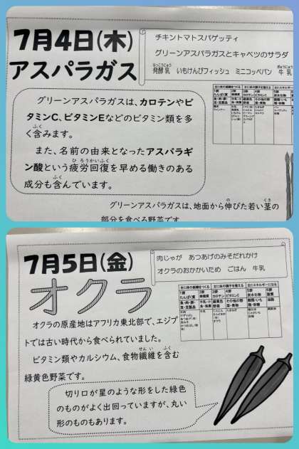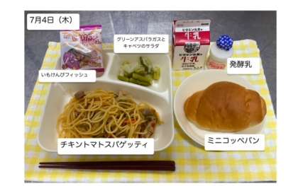本日の給食では、「チキントマトスパゲッティ・グリーンアスパラガスとキャベツのサラダ」などが提供されます。しっかり食べて、暑さに負けない健康の保持増進に努めましょう。