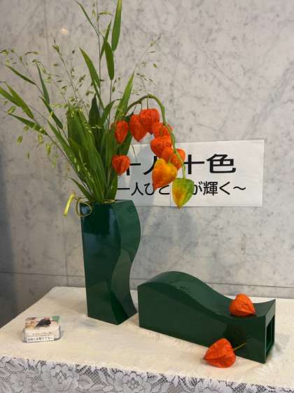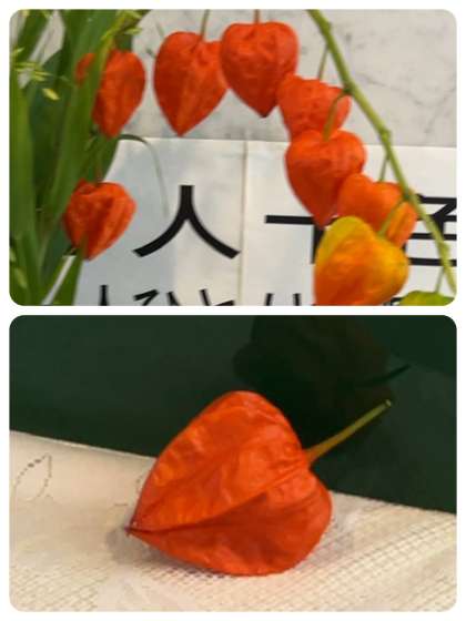 玄関のお花を生け替えていただきました。お題は『光の行方』。「鬼灯(ほおずき)は手に取って、しばし遊んでください」との添え書きもしていただきました。優しく扱ってくださいね。お花は『鬼灯(ほおずき)・ハラン・ワイルドオーツ』。いつも東中生のためにありがとうございます。