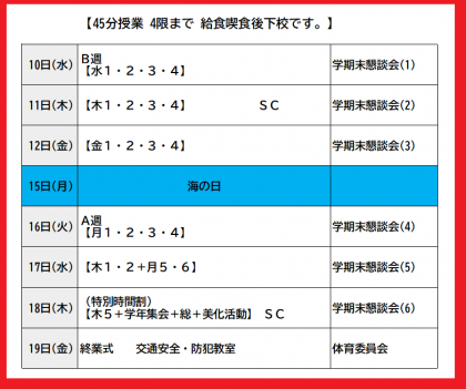 さて、生徒たちは、4時間目の授業が終了後、給食を喫食してからの下校になります。部活動は、顧問の先生の連絡をお子様を通じてご確認ください。