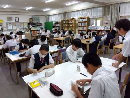 2年国語:区内小中学生向け課題「伝えよう!いのちのつながり」の作文応募のため、図書室で取り組んでいます。静かに集中して取り組むことができていました。