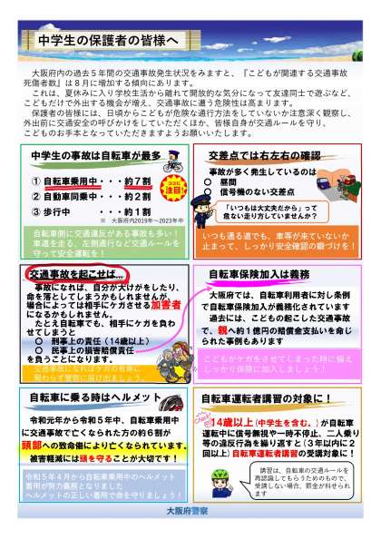大阪府警察本部交通部交通総務課より、交通事故防止対策の一環として資料の配付がありました。