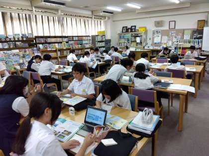 1年社会:各国を紹介する新聞を書いています。図書館の資料やタブレットで調べて作成しています。