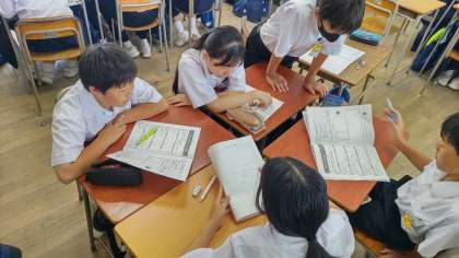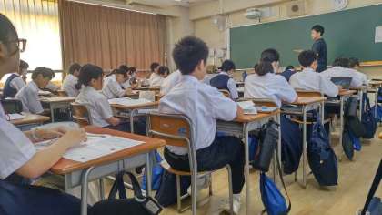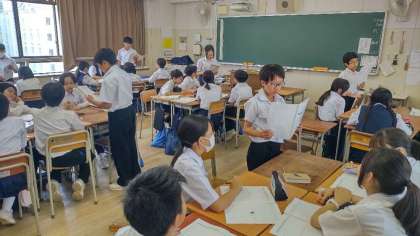 クラスによってさまざまな方法がありましたが、立ち上がって発表する生徒に体を向けて聞く姿や、額を突き合わせて班員の発表を真剣に聞く姿が見られました。