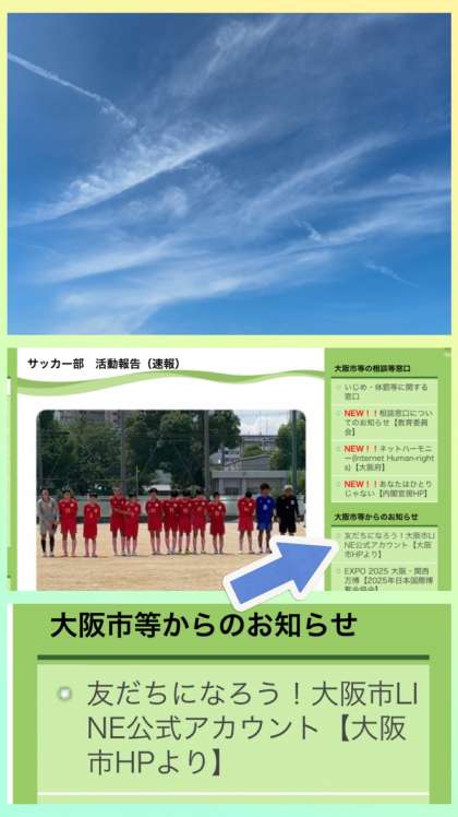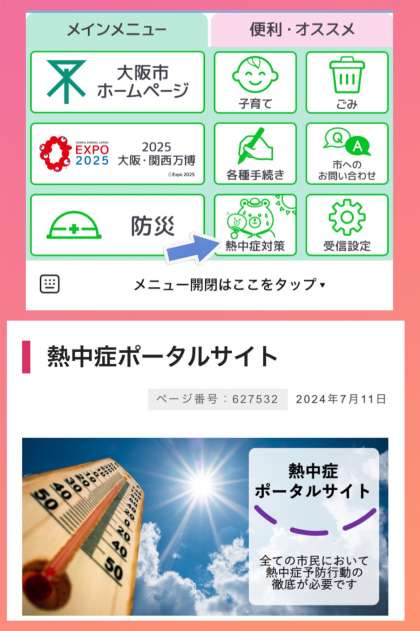 大阪市のWEBサイトでは、LINE公式アカウント『友だちになろう!大阪市公式アカウント』にアクセスすると生活に必要な情報が入手できます。給食ですでに登録済みの方は、届いているトークのメニューから『熱中症対策』をタップしてください。