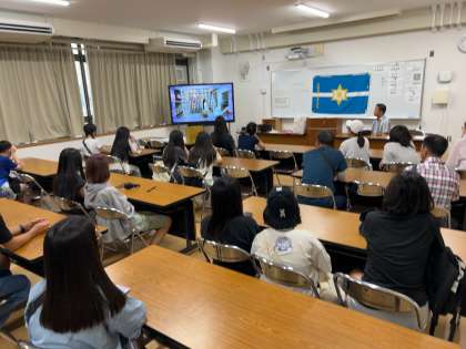 次に、生徒たち一行は、校内の見学をしました。最初に、和室で正座をして、茶道についての簡単な説明を聞いた後、新校舎に移り、理科室・美術室・音楽室、そして、吹奏楽部の学期が置いてある多目的室を興味深く、見学されました。最後に、グランドで練習した野球部を見学しました。