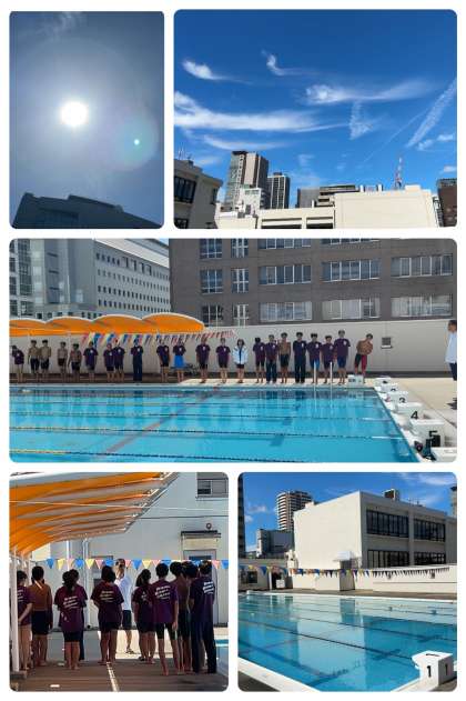 プールサイドでは、水泳部が練習前のミーティングで注意事項の確認。
