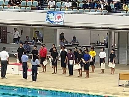 緊張感に包まれた開会式で、フェアマナーカップを返還した部長が、見事に200mバタフライ3年男子で入賞しました!!