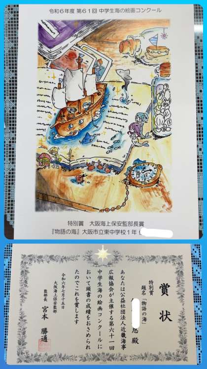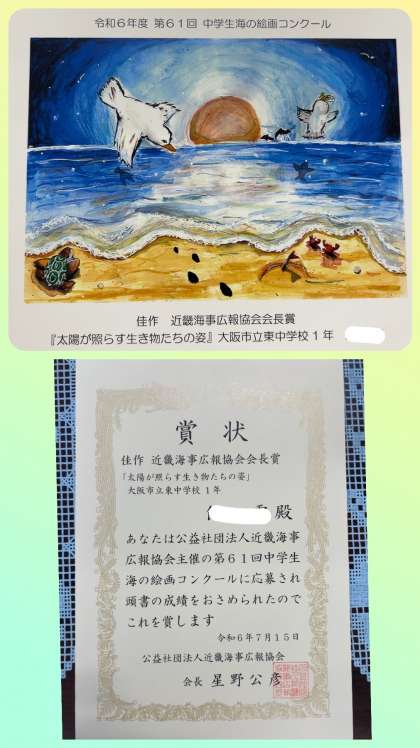 東中1年生の3人が、『第61回中学生 海の絵画コンクール』で、『特別賞』と『佳作』を受賞しました。おめでとうございます。このコンクールは、「海に親しみ、海事産業(海を舞台に活動を続けている海運・造船・港湾・物流・水産・海洋レクリエーションなど)への関心と知識を深めること」を目的として、海に関する写生画・未来図など広く海にかかわる絵画を、『私の海』をテーマに募集があり、応募したものです。