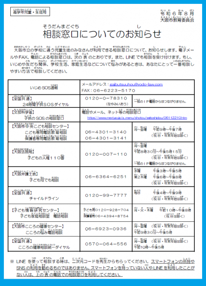 また、何かモヤモヤした気持ちのある人には相談窓口がいくつもあります。必要に応じて利活用してください。こちらをクリックするとご覧いただけます。