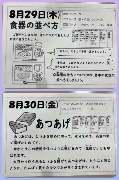 明日は、「マーボーあつあげ丼・あっさりきゅうり・りんご(カット缶)・牛乳」が提供されます。お楽しみに。