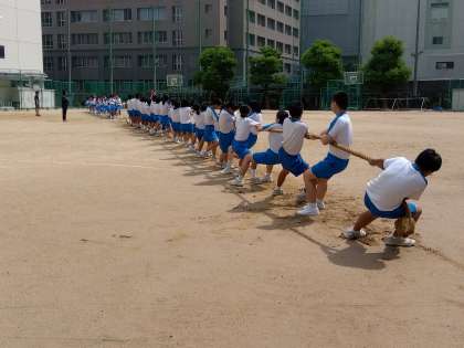 2年体育:体育大会にむけて綱引きの練習をしました。本番さながらに気合が入っていました。