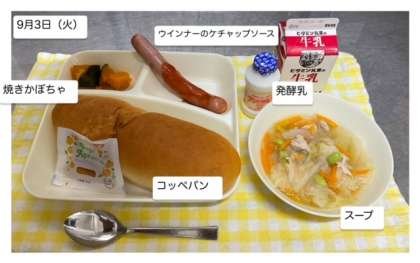 本日の給食です。本日の給食には、「ウインナーのケチャップソース・スープ・焼きかぼちゃ・発酵乳・コッペパン・アプリコットジャム・牛乳」が提供されます。
