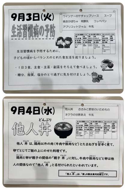 明日は「他人丼・ささみと野菜のいためもの・オクラの甘酢あえ・牛乳」が提供されます。お楽しみに。