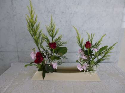 今回は、雪冠杉、バラ、ストック、かすみ草を使った作品です。