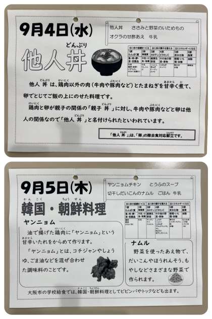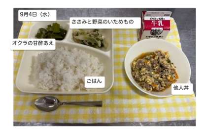 本日の給食には、「他人丼・ささみと野菜のいためもの・オクラの甘酢あえ・牛乳」が提供されます。しっかりいただいて、残食ゼロをめざしましょう。