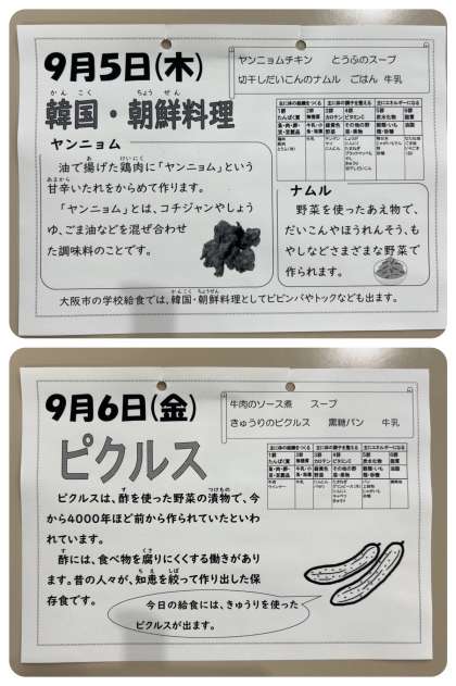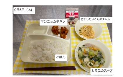 本日の給食には、「ヤンニョムチキン・とうふのスープ・切干しだいこんのナムル・ごはん・牛乳」が提供されます。しっかりいただいて、午後からの授業や活動に取り組みましょう。