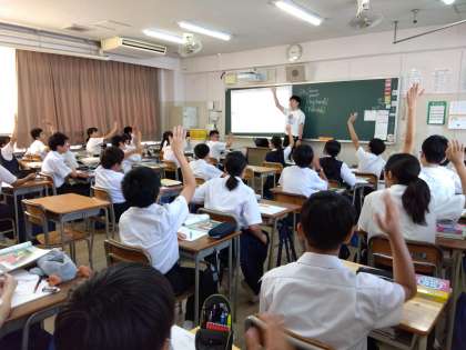 1年英語:Which is 〜.の学習をしました。先生が英語でした質問に元気に答えました。
