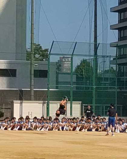 本日まで教育実習に来ていた先生方のうち、お一人が体操を専門にしておられることもあって、教育実習担当の先生から促されて生徒に披露してくれたのは…。