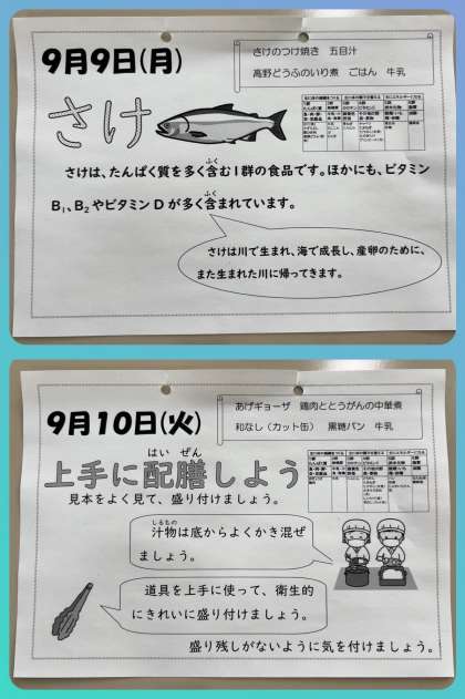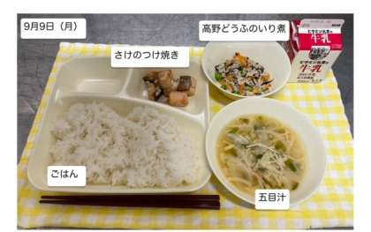 本日の給食では「さけのつけ焼き・五目汁・高野どうふのいり煮・ごはん・牛乳」が提供されます。しっかりいただいて、午後の活動に取り組みましょう。