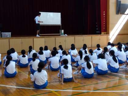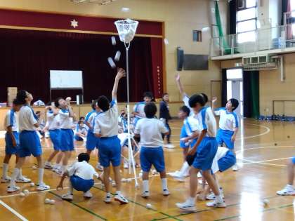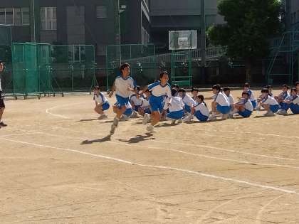 暑い日が続いています。写真は1年生の体育の様子です。運動場で取組と室内の取組を組み合わせ、熱中症対策をして授業を進めています。