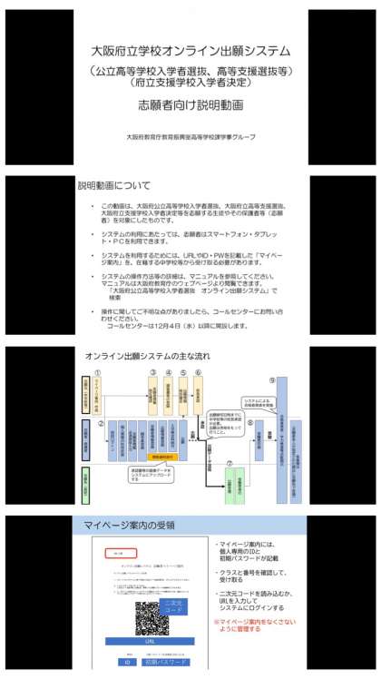 大阪府教育庁のWEBサイトに「オンライン出願システムの志願者向け動画について」に係る説明動画が掲載されました(9月13日)。今年度から大きく手続きが変わっていますが、本人と保護者の皆さまにオンライン上で行っていただく手続きがわかりやすかく動画にまとめられています。『百聞は一見にしかず』です。とりわけ、『大阪府公立高校』への出願を考えているご家庭は、生徒の皆さんは保護者と一緒に出願方法を確認しておいてください。