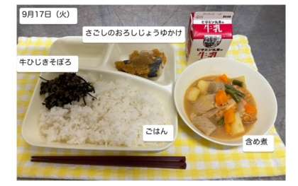 本日の給食では「さごしのおろしじょうゆかけ・含め煮・牛ひじきそぼろ・ごはん・牛乳」が提供されます。