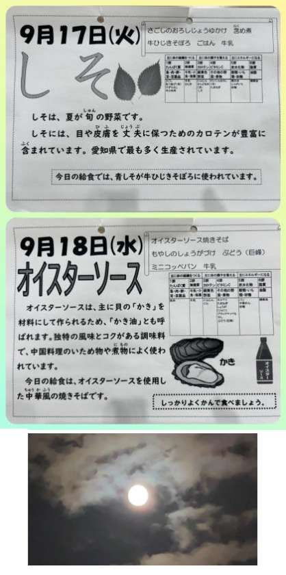 さて、中秋の名月は今夜です。昨夜はキレイなほぼ「満月」でした。体育大会では、お弁当の用意をありがとうございました。大きな行事を終え、2学期は次のステージに進みます。給食をしっかりいただいて、健康の保持増進に努めましょう。