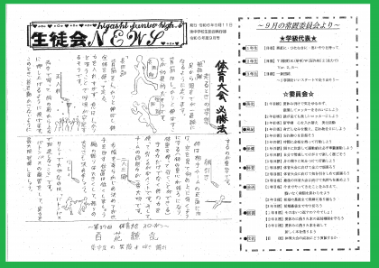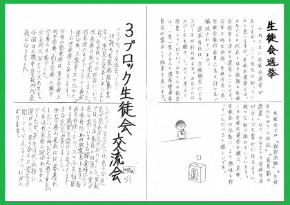 今月号の表面では、定例の各常置委員会からのレポートと「体育大会必勝法」の記事が掲載されています。裏面では10月2日に行われる「生徒会選挙」と8月に行われた「3ブロック生徒会交流会」についての記事が掲載されています。