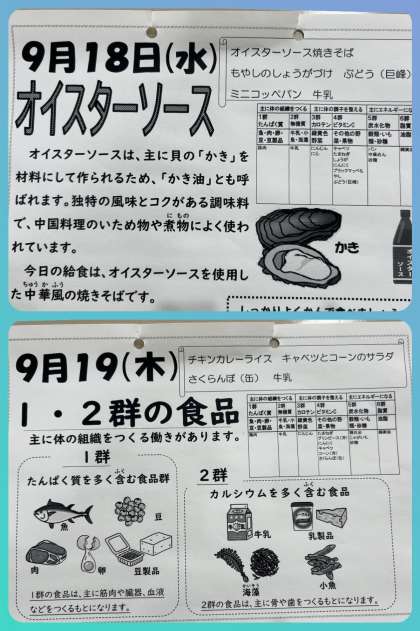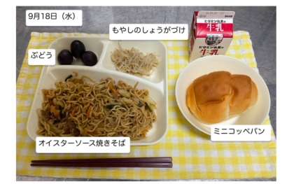 本日の給食では「オイスターソース焼きそば・もやしのしょうがづけ・ぶどう(巨峰)・ミニコッペパン・牛乳」が提供されます。よくかんでいただいて、残食ゼロをめざしましょう!