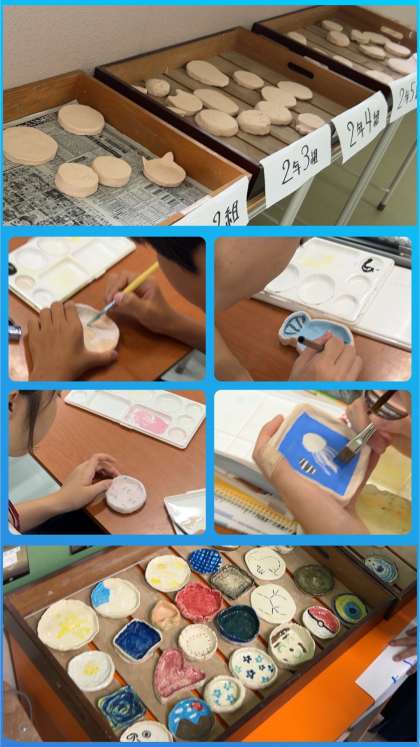 3年生の美術の授業では、焼き物の完成に取り組んでおり、新校舎に移設した窯を初めて使いました。この作品は、2年生の時に作っていた豆皿(陶芸)を、2学期に素焼きをして、彩色をして、本焼きして完成です。