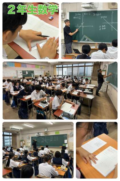 2年生の数学では「一次関数」についての学習です。式からグラフを描くことを確認し、今日は、与えられた条件から式を求める問題に挑んでいます。表と式とグラフを使って、変化する2つの数量を取り出して、関数関係を見い出し、数学的に表現し、考察する能力の育成を図ります。