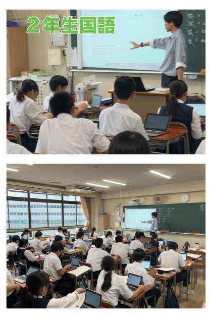 2年生の国語では、明日の研究授業に向けての事前の学習です。各班で考えたことをTeamsで先生が集約し、スクリーンに映していきます。また、4人が4種類のプリントを手元に置き、それぞれのミッションに取り組んでいきます。これまで学習してきた「平家物語」を教材に、生徒たちが、どう展開していくのか、明日が楽しみです。