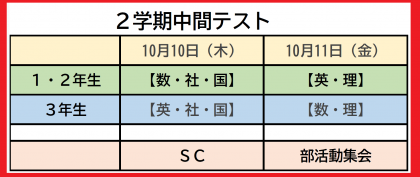 テストの範囲の一覧は、すでに配布されているように、1学期の期末テスト(6月19日〜21日)以降の学習内容が中心になります、しっかり復習をして、基礎・基本を定着させ、問題演習に挑み、活用する力を付けてから、中間テストに挑みましょう。もちろん、提出物は期日を守り、内容を充実させて提出しましょう!!